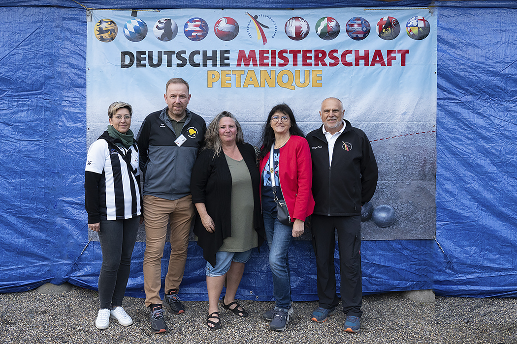Das Foto zeigt von links: Schiedsrichterin Melanie Dyrla, 1. PC Vorsitzender Tobias Ungermann, NRW Petanque-Präsidentin Sandra Pahl, Bürgermeisterin Elke Kappen und Deutscher Petanque Verband Vizepräsident Hugo Port.