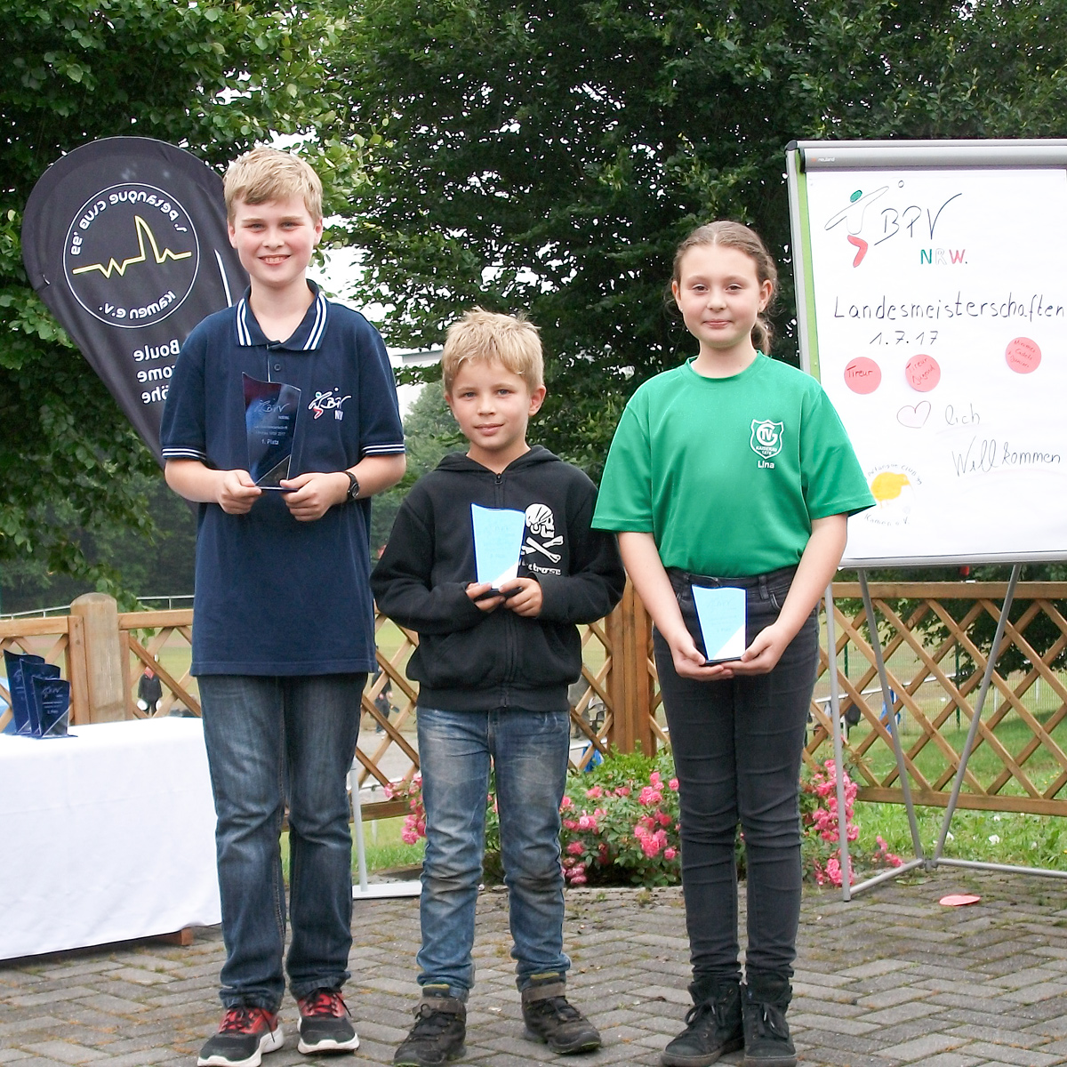 Gold und Bronze für die Kamener Jugend im Pétanque! In der Gruppe der Minimes (Alter bis 11 Jahre) blieb Elias Kulinna vom 1. PC 99 Kamen bis zum Schluss hochkonzentriert und erkämpfte sich so ungeschlagen am Samstag mit 5 Siegen den Titel „Landesmeister NRW im Tête-à-tête (1 gegen 1)“. Ebenfalls mit einer tollen Leistung und 4 Siegen errang Lina Grundmann vom TVG Kaiserau die Bronzemedaille und vervollständigte so hinter Mathis Schulz aus Ibbenbüren den großen Erfolg für die Kamener Boulespieler!