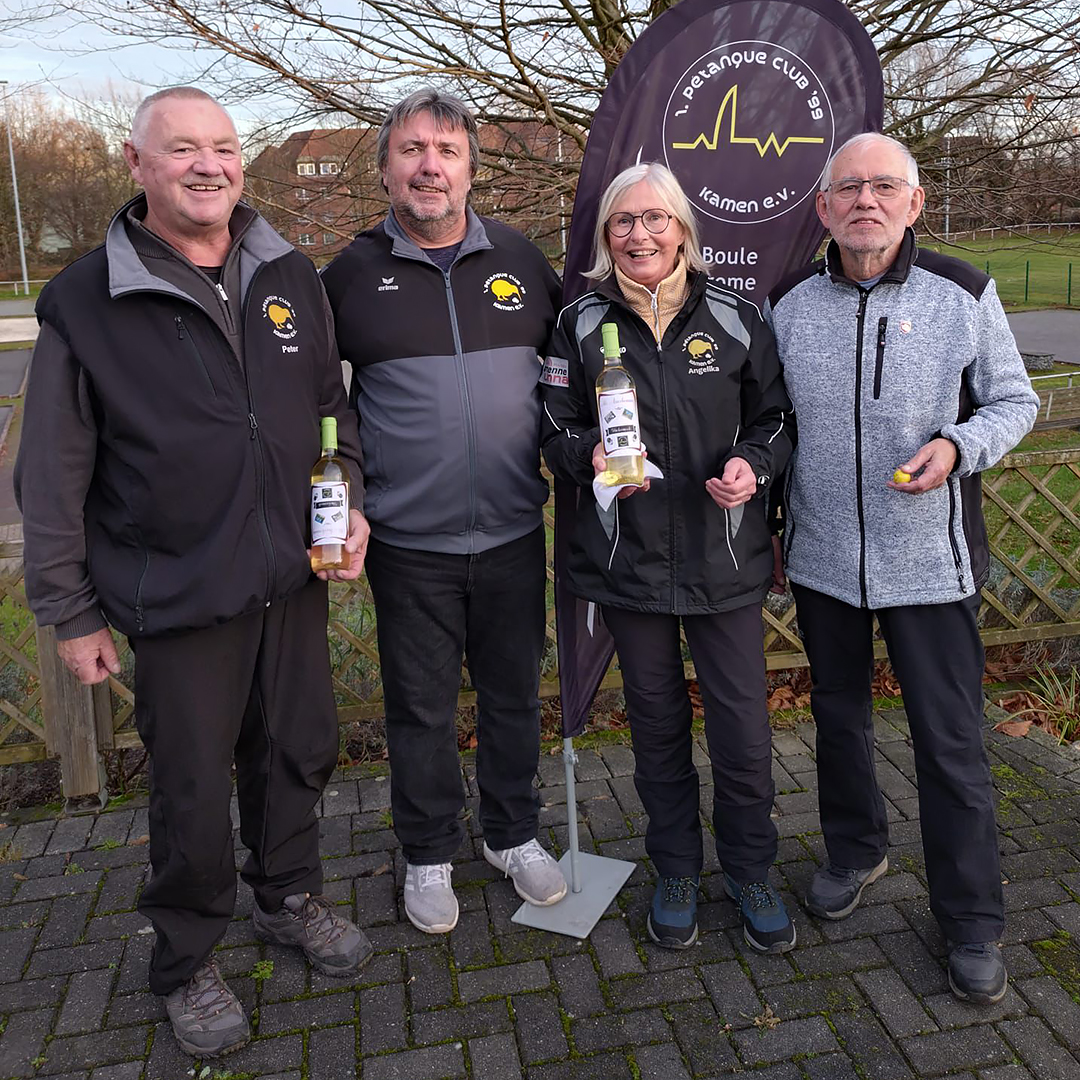 Mit ihrem schon traditionellen Jahresabschlussturnier beendeten die Mitglieder des 1. Pétanque Clubs 99 Kamen im „Boulodrome“ auf der Lüner Höhe ihre diesjährige Wettkampfsaison. 20 Spielerinnen und Spieler traten bei diesem internen Turnier im Doublette nach dem Modus „Super-Mêlée“ gegeneinander an. Und nach 4 zum Teil sehr spannenden Spielen stand das Ergebnis fest. Sieger des diesjährigen Wettbewerbes wurde ungeschlagen Heiner Kampe, gefolgt von Peter Schmidt und Angelika Lukat, die beide auch 4 Siege erringen konnten, dann allerdings das etwas schlechtere Punkteverhältnis hatten. Im Anschluss konnten die drei unter dem Beifall aller Mitspielerinnen und Mitspieler die Glückwünsche des 1.Geschäftsführers Peter Schauseil entgegennehmen, der auch die Turnierleitung übernommen hatte. Ein geselliges Beisammensein aller Teilnehmerinnen und Teilnehmer beendete diesen wieder einmal gelungenen Tag im „Boulodrome“.