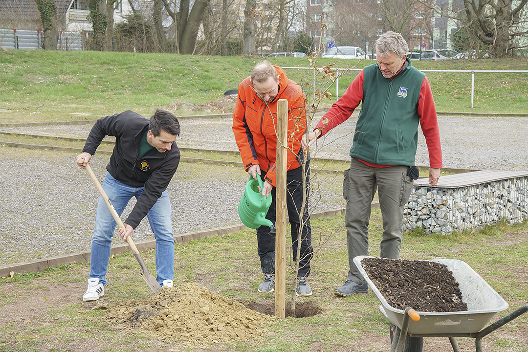 Unter großer Beteiligung der Mitglieder wurden am vergangenen Sonntag auf dem Gelände des 1. Pétanque Club 99 Kamen e.V. gemeinsam mit der Schutzgemeinschaft Deutscher Wald e.V. (SDW) in einer kleinen Feierstunde drei gespendete Bäume für die Einheit Deutschlands gepflanzt. Durchgeführt wurde diese Pflanzaktion auf Initiative des Sportwartes des 1. Petanque Clubs, Toni Roßdeutscher, gemeinsam mit dem Kreisvorsitzenden der Schutzgemeinschaft Deutscher Wald, Joachim Kallendrusch. In ihren Ausführungen gingen der PC-Vereinsvorsitzende Tobias Ungermann und des SDW Kreisvorsitzende Joachim Kallendrusch auf den Hintergrund dieser bereits seit langem geplanten Aktion ein.