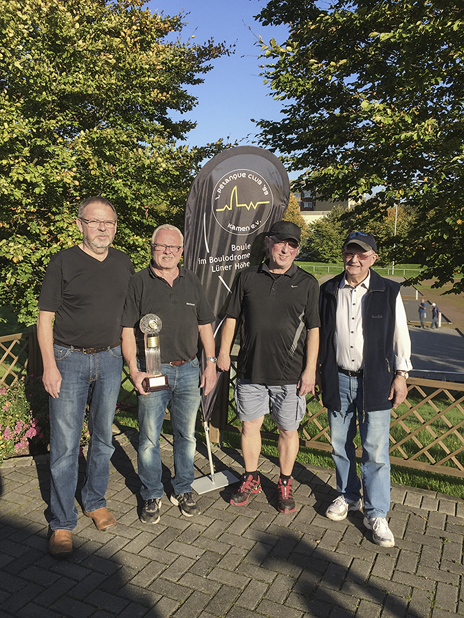 Manfred Rutke und Dieter Lukat sind die neuen Pokalsieger des 1. Pétanque Clubs 99 Kamen. Im Finale besiegten sie am Sonntag Franz Sieger und Klaus Thomas mit 13 : 3 und sicherten sich so den Titel, der in diesem Jahr zum 4. Mal vereinsintern ausgespielt wurde. Insgesamt beteiligten sich 18 Doublettes an diesem sportlichen Wettkampf, der über das ganze Jahr auf der Vereinsanlage, dem „Boulodrome“ auf der Lüner Höhe, im K.O.-Modus durchgeführt wurde. Den gemeinsamen 3. Platz belegten Tobias Ungermann und Bernd Hänsel sowie Heiner Kampe und Karl-Heinz Wölm, die zuvor im Halbfinale ausgeschieden waren.